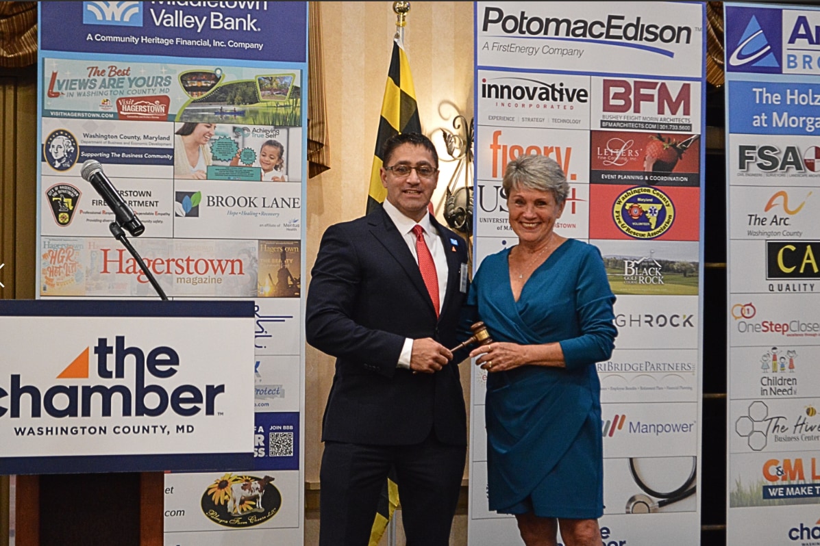 This year, The Chamber's Immediate Past Board Chair, Mary Ellen Waltemire of One Step Closer Coaching, did the honors in handing over the gavel to fiscal year 2026 Board Chair, Abraham "Abe" Perez, III of Middletown Valley Bank.